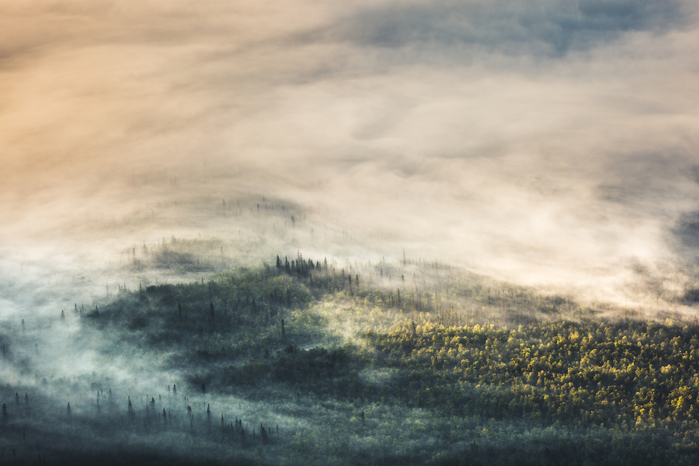 Figure 11 구름 위에서 눈을 뜨던 순간. 악세의 해가 지평선 위로 떠오르는 동안 구름이 나무 사이에서 춤을 추고 있는 풍경.