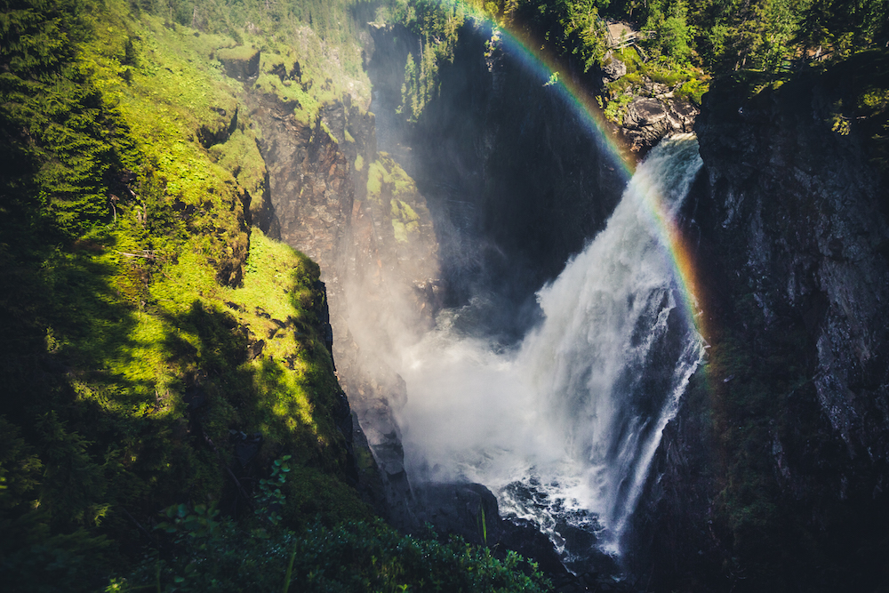 Figure 2 종일 모기떼로 가득한 숲을 하이킹한 끝에 받은 깜짝 선물. 폭포는 약 40m 높이로 800m 길이의 북유럽에서 가장 긴 강 협곡까지 이어진다.