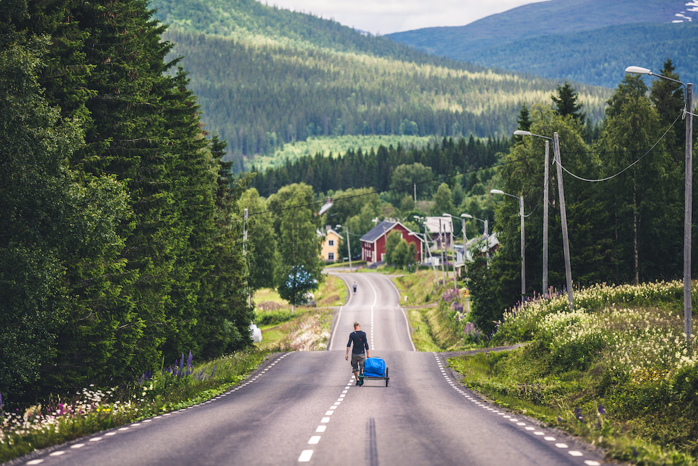 Figure 3 마틴 앤더슨이 북부 잠틀란드의 외로운 도로를 걷고 있는 모습. 현지인의 도움으로 오래된 우유 카트를 빌려 산길이 다시 나타날 때까지 그 곳에 짐을 싣고 길을 걸었다. 사람들의 이목을 끈 덕분에 맥주와 사탕 등을 선물 받기도 했다.