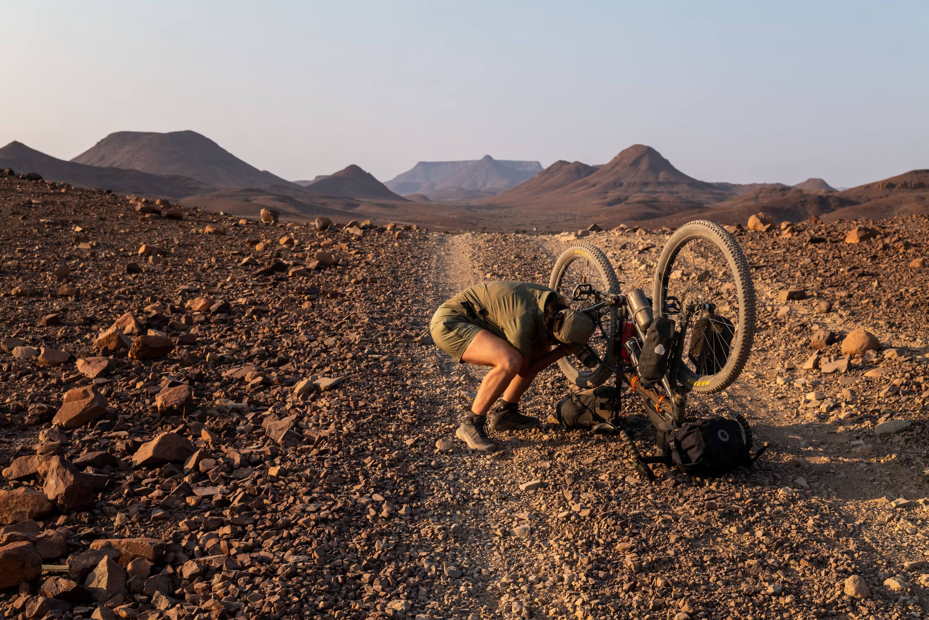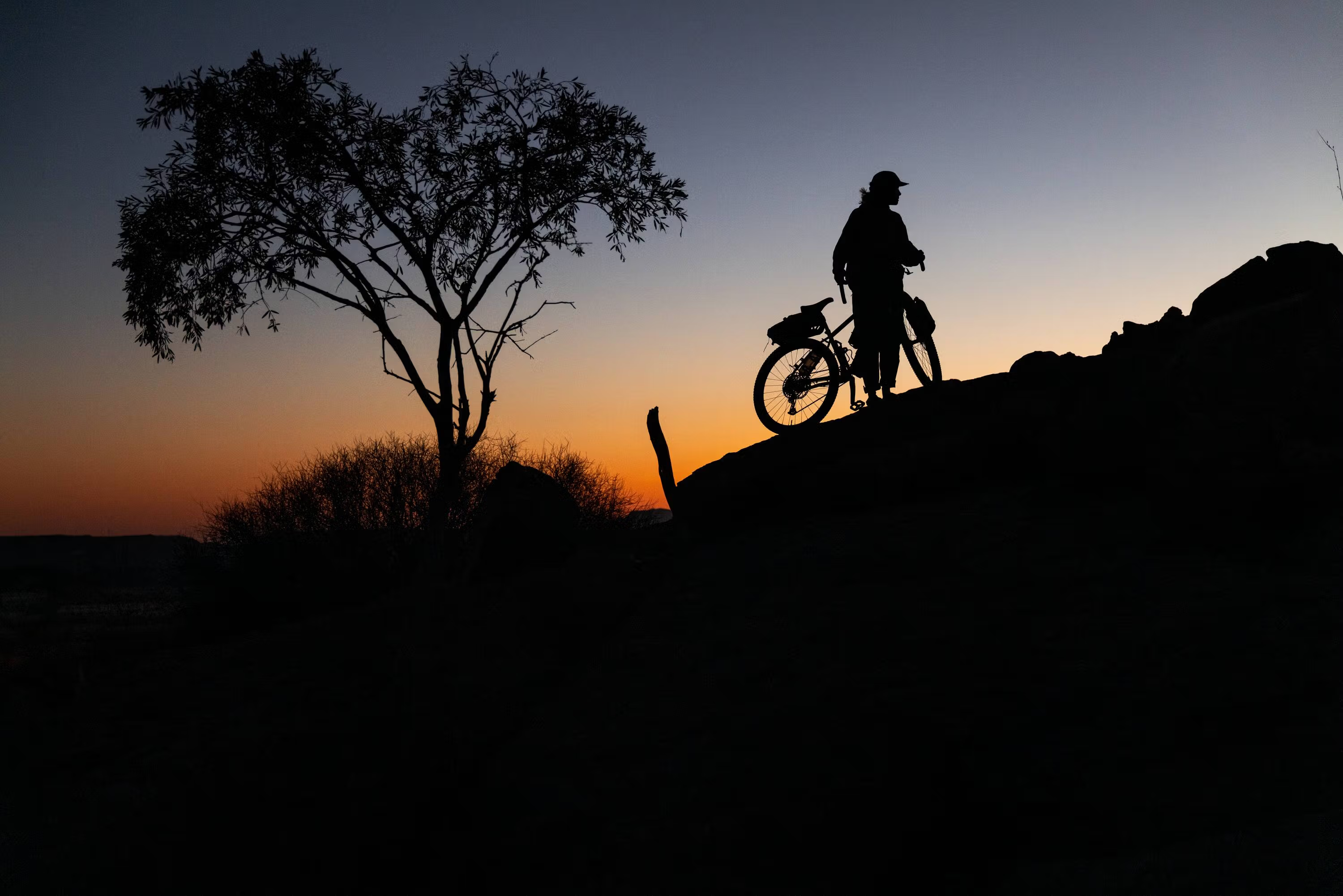 앙골라 국경에서 그들은 자전거를 타고 나미비아를 지나 남쪽으로 향했습니다. 다마랄란드(Damaraland )와 데솔레이션(Desolation Valley)를 향해 나아가는 동안, 숨 막힐 듯 아름다운 산악 지대에서 사막 코끼리, 코뿔소, 얼룩말을 만났습니다. 5 주간의 자전거 여행 끝에, 산들바람이 부는 대서양 연안에 다다랐습니다. 헨티스 베이(Henties Bay)에서 잠시 정차한 후, 강한 역풍을 뚫고 스와코프문트(Swakopmund )에 도착했습니다. 더위, 짐 싣고 가는 자전거, 울퉁불퉁하고 모래투성이인 길은 힘든 조합이지만, 옌스와 제니는 유연한 사고방식, 충분한 휴식, 그리고 웃음이 함께했던 덕분에 아프리카 여행이 특히 만족스러웠다고 말합니다. 옌스는 이렇게 말합니다. "자전거 배낭을 메면 필요한 모든 것을 가지고 다니게 되고, 매일 해야 할 일은 아주 간단합니다. 최선을 다해 페달을 밟는 거죠. 텐트를 치고 침낭 속으로 기어들어가 지치고 뻐근한 몸으로 별을 바라보는 건 정말 놀라운 경험이었습니다."