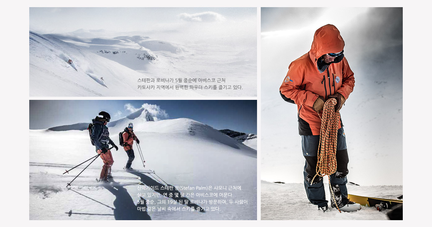 20년이 지나고, 스테판은 숙련된 산악가이드로써. 일본의 북해도와 칠레의 안데스, 인도, 유럽 알프스, 노르웨이 북부와 스웨덴 북부 라플란드까지 전세계를 누비며 일하고 있습니다. 각각의 겨울은 몇 달간 이어지며 그의 베이스 캠프인 북극권의 아비스코에서 마무리 됩니다.