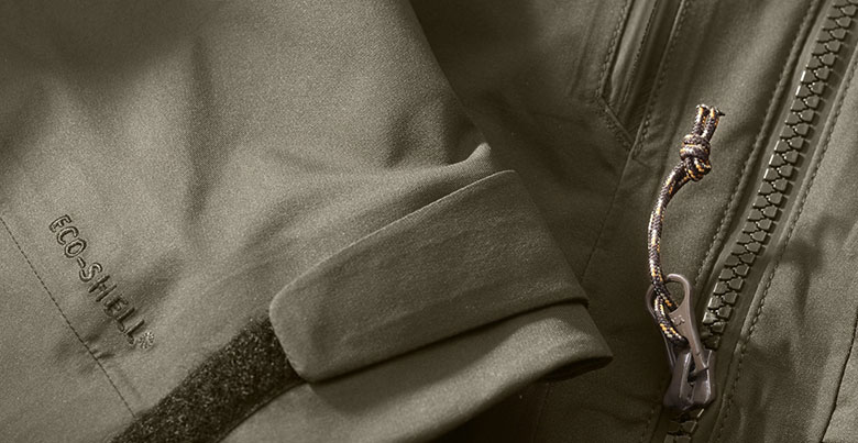 에코-쉘은 발수 기능(The durable water repellent, DWR)을 만들기 위해 PFC(과불화탄소화합물)가 없는 친환경 발수 처리를 합니다. 가능한 한 환경과 인체에 나쁜 영향을 끼치지 않게 하기 위한 피엘라벤의 선택입니다. PFCs는 분해되지 않고 환경에 축적되어 먹이사슬에 서서히 작용하여 인체와 환경에 유해한 영향을 미치게 됩니다. 따라서 에코-쉘 의류를 선택한다는 것은, 자연에 이 유해 물질을 노출되지 않도록 실천했다는 것을 의미합니다. 대신 에코-쉘이 발수 기능을 지속적으로 유지하기 위해서는 추가적인 관리가 필요합니다.