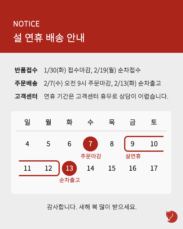 [공지] 설 연휴 배송 및 고객센터 휴무 안내